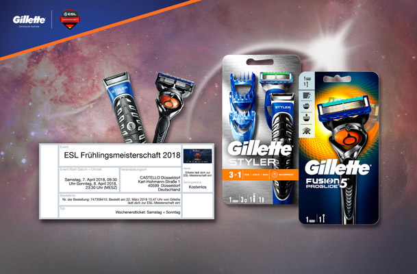 JETZT SCHNELL – Gemeinsam mit Gillette – dem offiziellem Partner der ESL Meisterschaft 2018 – könnt Ihr bei uns Tickets und einen Gillette Goodiebag für die Finals der ESL Frühlingsmeisterschaft 2018 gewinnen.